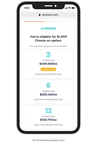 *All financing is subject to credit approval. Your terms may vary. Payment options through Wisetack are provided by our lending partners. For example, a $1,200 purchase could cost $104.89 a month for 12 months, based on an 8.9% APR, or $400 a month for 3 months, based on a 0% APR. Offers range from 0-35.9% APR based on creditworthiness. State interest rate caps may apply. No other financing charges or participation fees. See additional terms at https://www.wisetack.com/faqs.